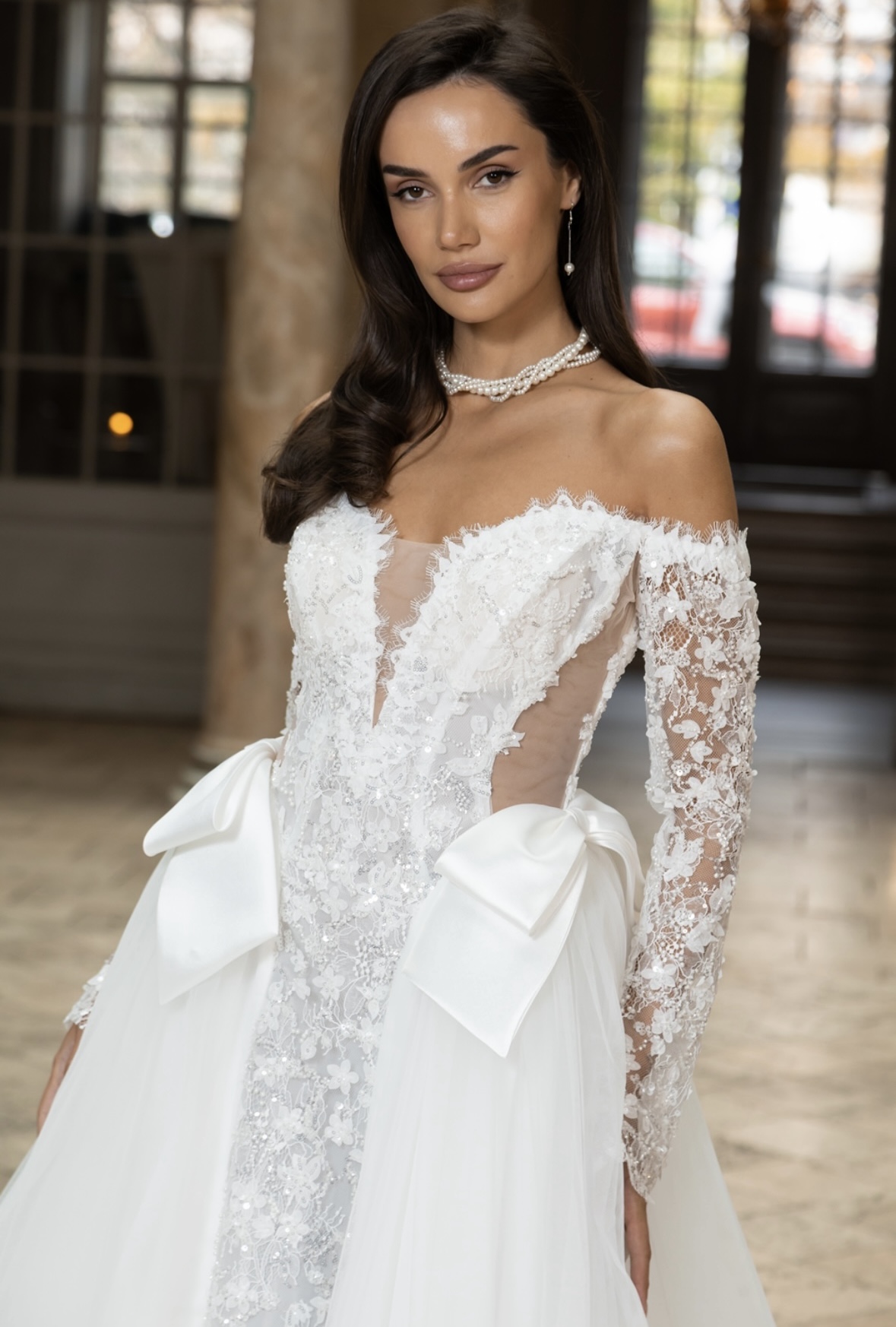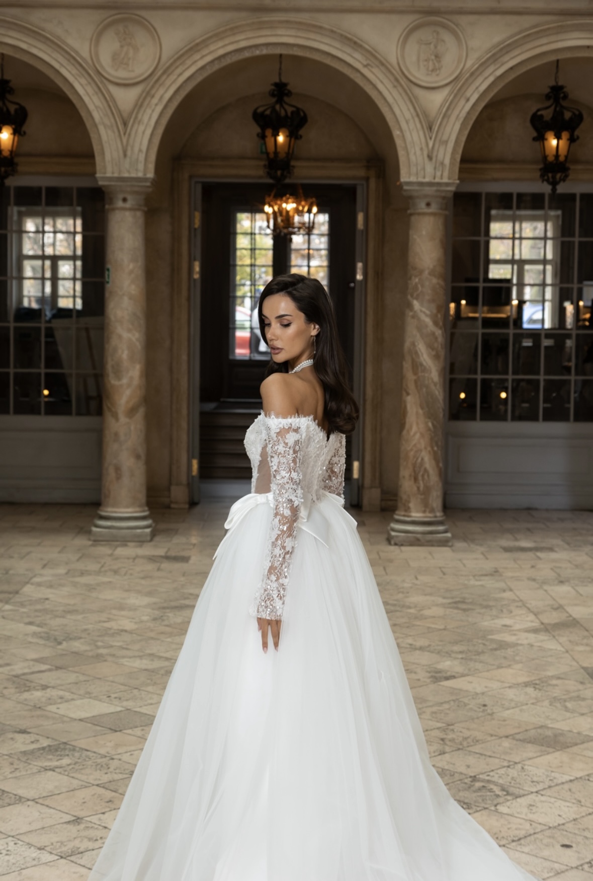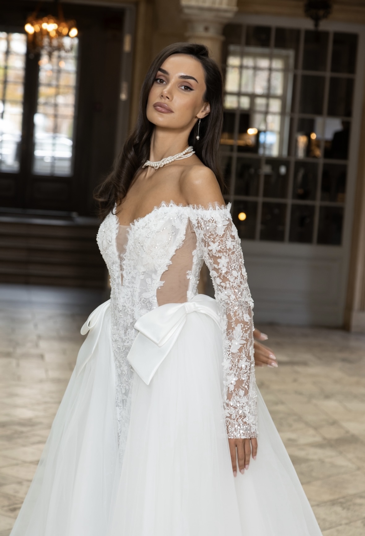 Свадебное платье Глория - модель из премиум коллекции. Кружевной корсет, переходящий в низ юбки, объемные элементы со съемным декором, аккуратный шлейф и рукава.