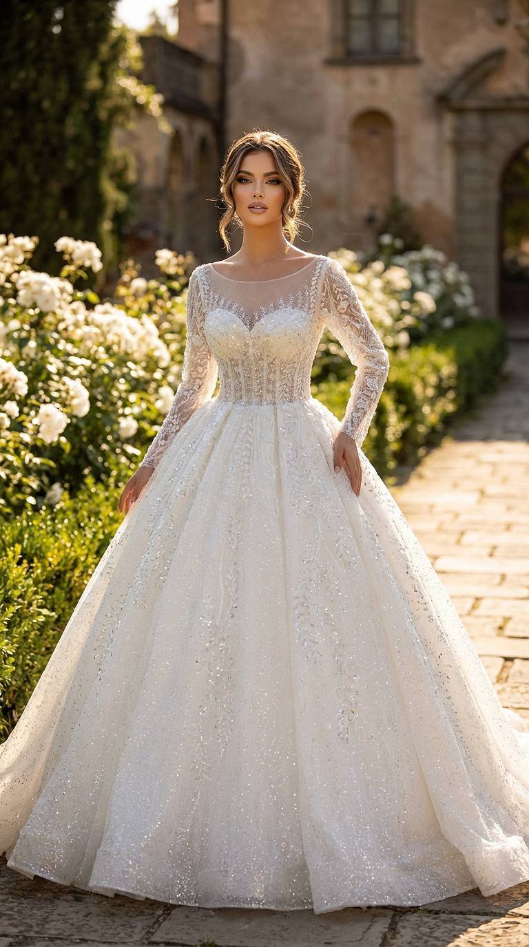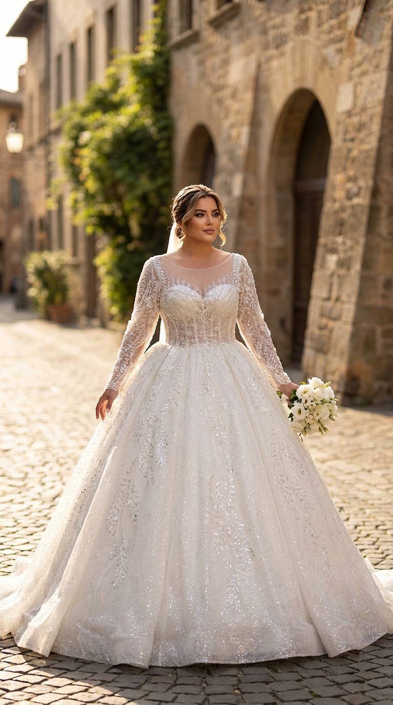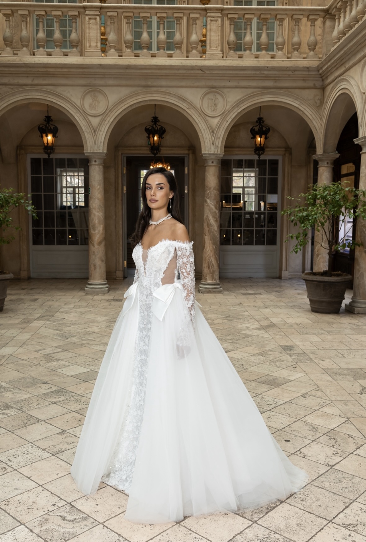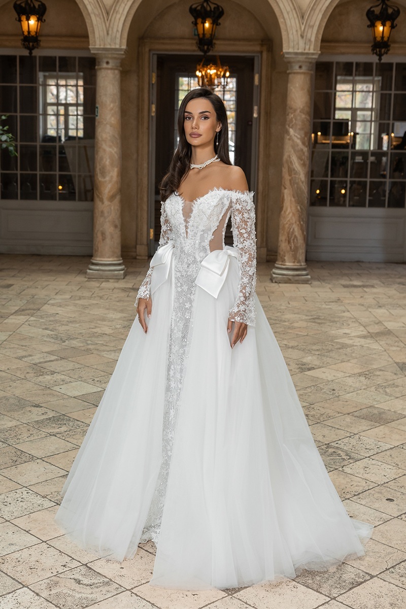 Свадебное платье Глория - модель из премиум коллекции. Кружевной корсет, переходящий в низ юбки, объемные элементы со съемным декором, аккуратный шлейф и рукава.