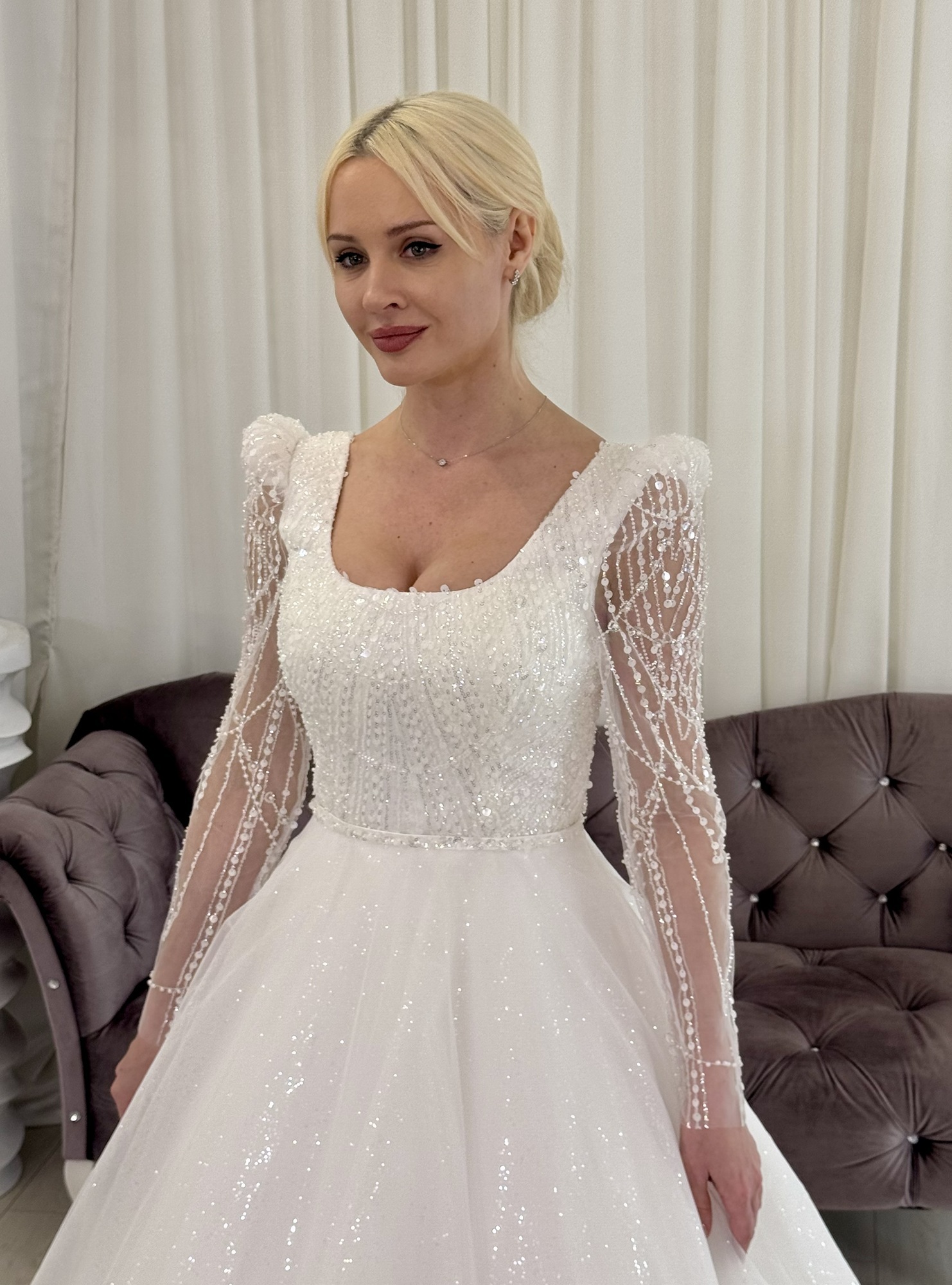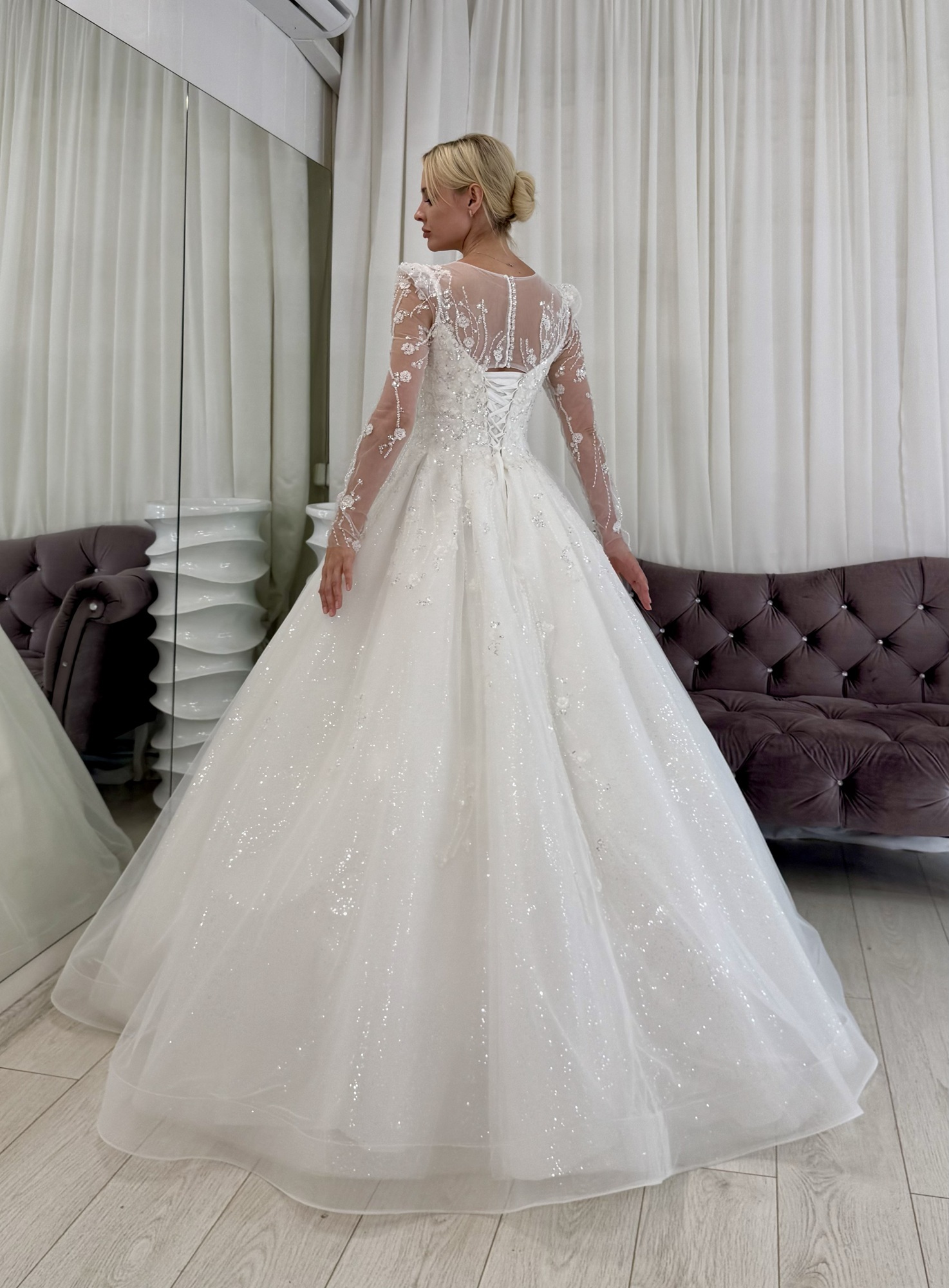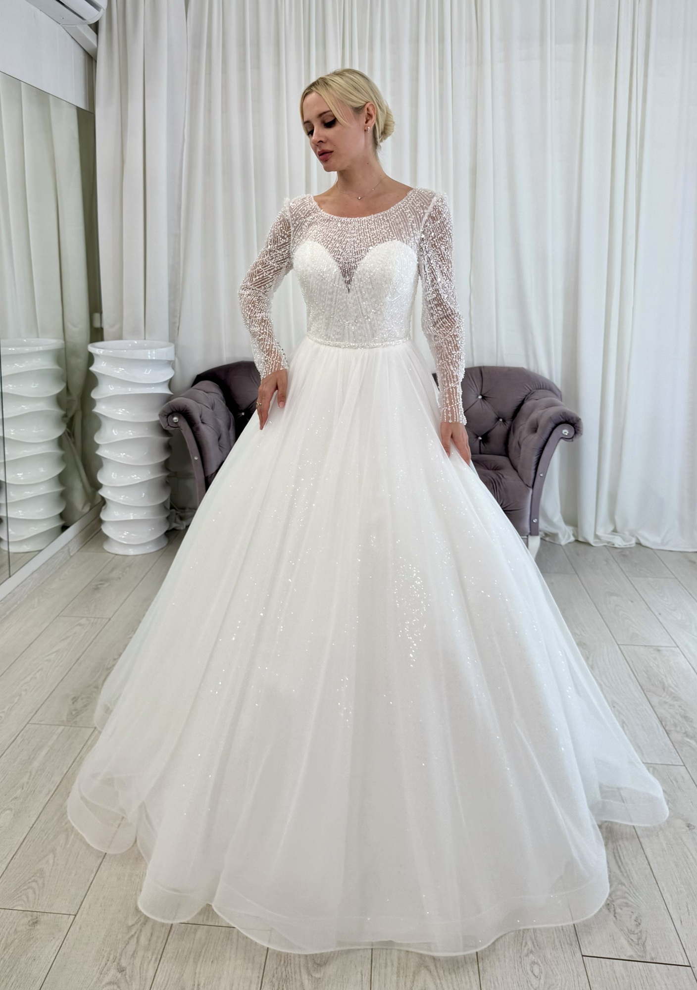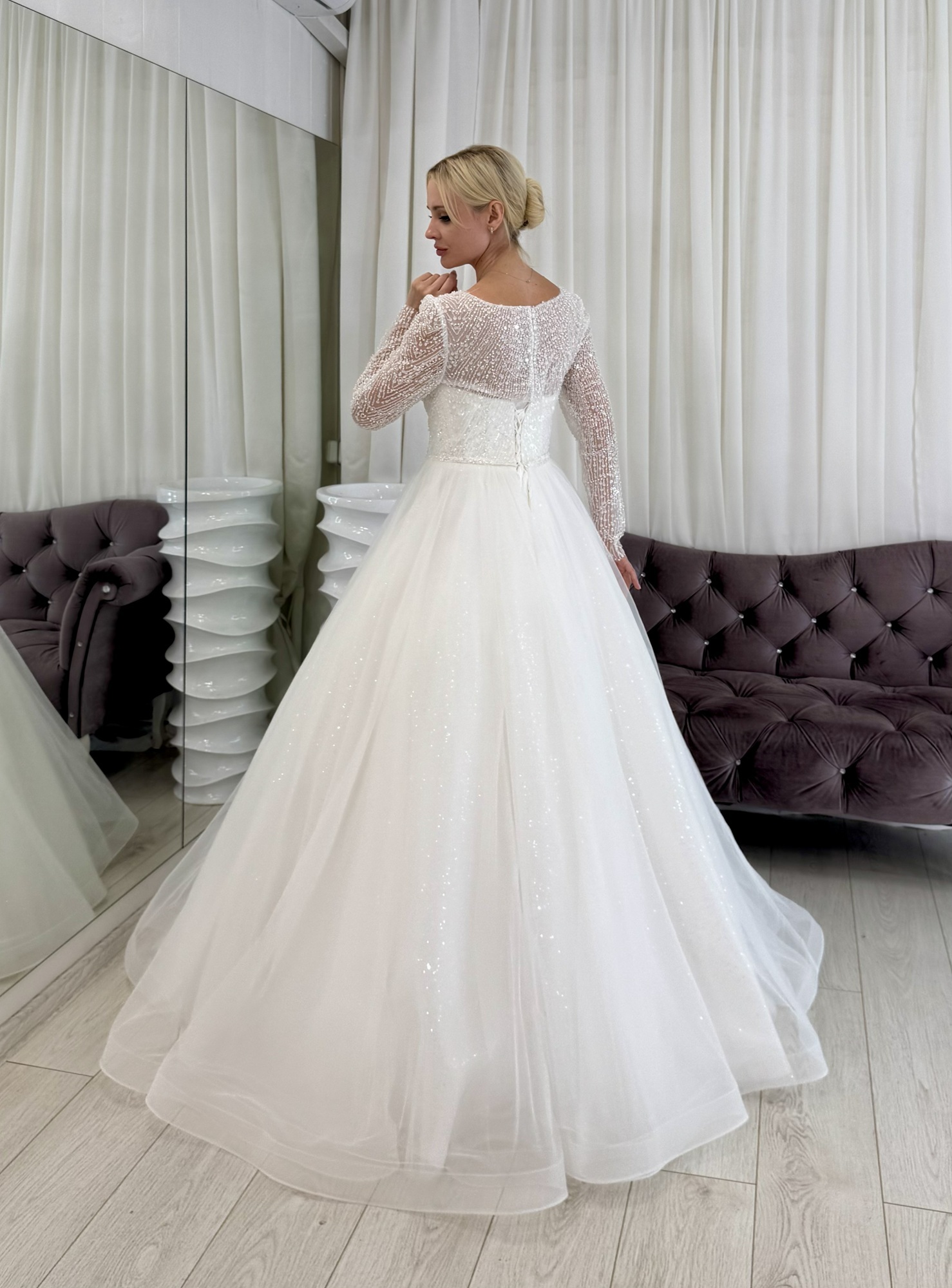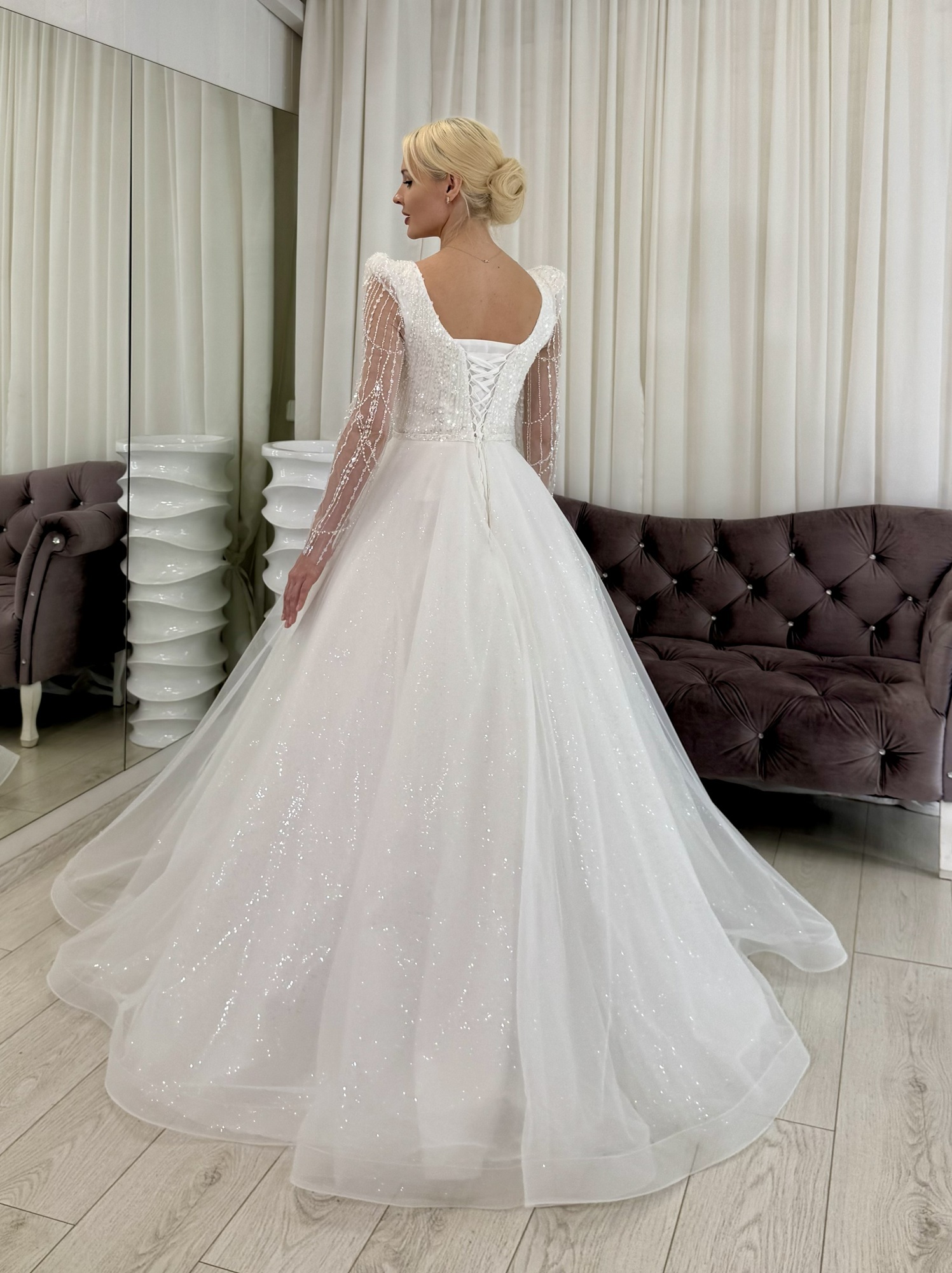 Свадебное платье Хана - сверкающая юбка глиттер с запАхом, полупрозрачный корсет с чашками и жемчугом.